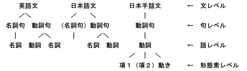 以上で図示したように、言語のレベルを考慮して考えると、三者の違いがわかります。このレベルの違いを無視して、主語、述語、目的語といった概念を考えても、混乱するだけです。またこの説明から、日本手話については、形態素レベルの考察が基本になることもわかります。